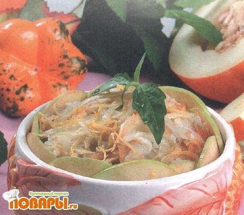 Дыню и яблоки (с удаленной кожицей и сердцевиной) нарезают соломкой, соединяют с тыквой, заправляют соком лимона по вкусу.