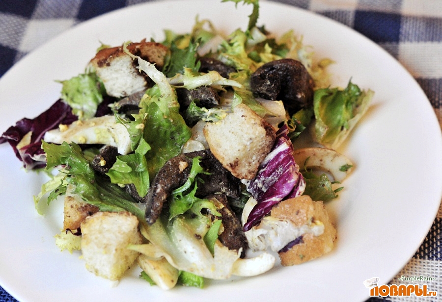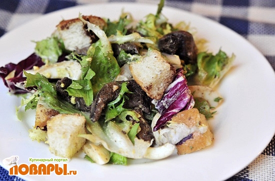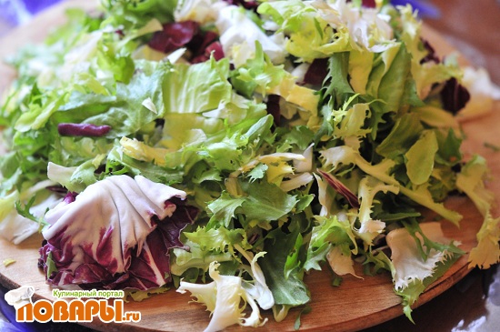 Листья салата выложить в общую посуду, по желанию можно дополнительно опрыскать их бальзамическим уксусом, а так же оливковым маслом.