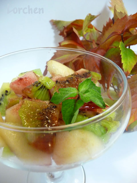 Уложить фрукты в бокалы, полить сиропом и посыпать сахаром.
