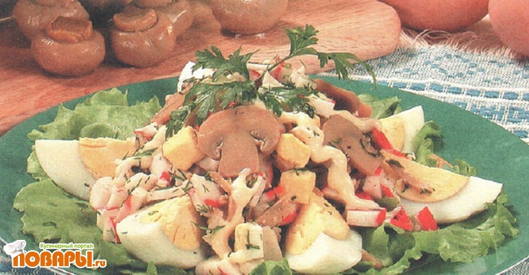 Подготовленные продукты укладывают на блюдо, чередуя с дольками яиц, поливают майонезом и украшают зеленью.