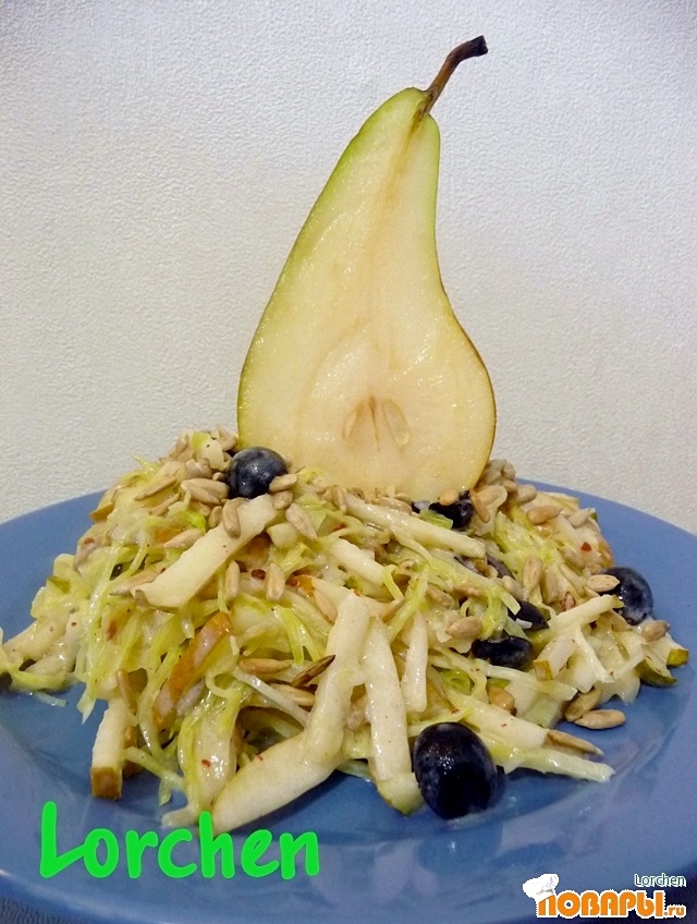 Выложите капусту, груши и маслины на блюдо, полейте соусом (желательно перед подачей салата), сверху посыпьте семенами подсолнечника.