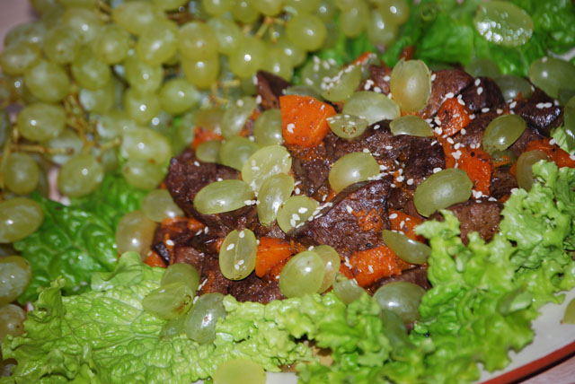 Салат из куриной печени, тыквы и винограда