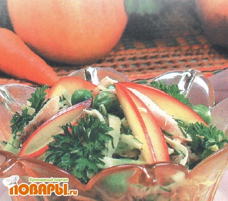 Соединяют подготовленные продукты, добавляют горошек и заправляют салат сметаной.