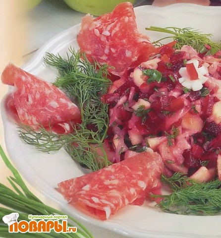Квашеную капусту нарезать квадратиками. Свеклу сварить, остудить, очистить от кожуры и нарезать кубиками. Яблоко очистить от кожуры и семян и также нарезать кубиками (желательно, чтобы кубики по размеру были одинаковыми).