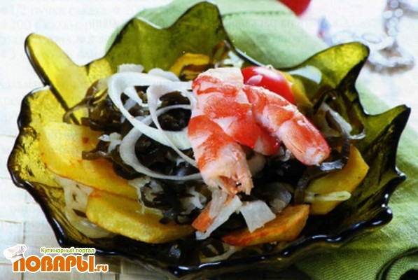 В салатник выложить часть салата, затем слой картофеля, сверху - оставшийся салат. Украсить кольцами лука-порея и креветками.
