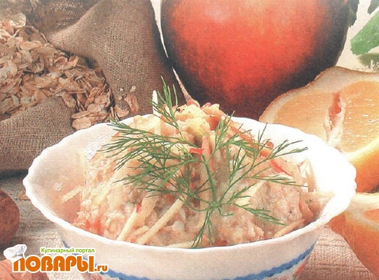 Соединяют яблоки и хлопья, добавляют мед, орехи и перемешивают.