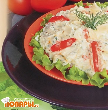 В салатник, дно которого устлано листьями зеленого салата, выложить полученную массу и полить оставшейся сметаной. Украсить зеленью, дольками помидоров.