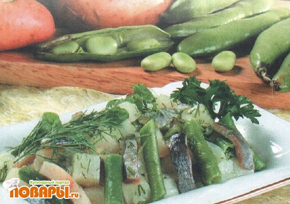 Продукты соединяют и заправляют майонезом, смешанным с рубленым луком и перцем.