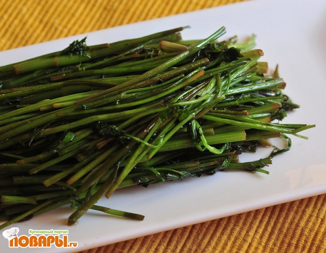 Несложный и вкусный рецепт салата из стеблей зелени с заправкой из соевого соуса и меда.