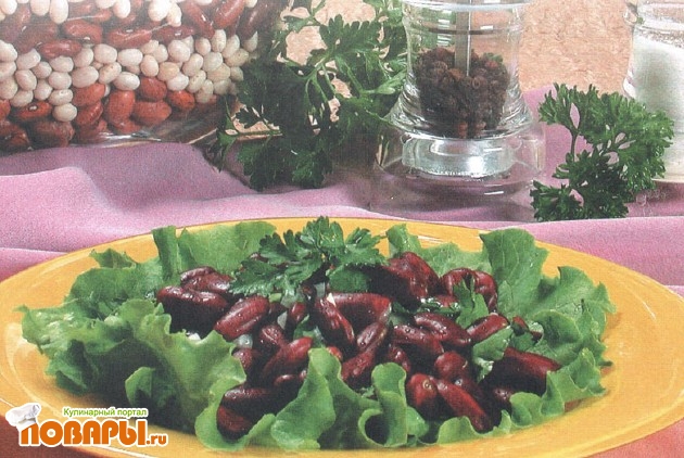 Фасоль соединяют с мелко нарезанными луком и чесноком, добавляют крупно нарезанную петрушку. Перемешивают и охлаждают.