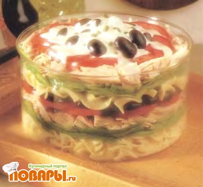 Тунец - незаменимый компонент этого слоеного салата с лапшой. Тренетте придает блюду великолепный вид. Но вы можете также использовать вместо нее любую плоскую лапшу. Лапша тренетте с волнистыми краями разделяет слои тунца, фасоли, маслин и помидоров. Особенно нарядно салат выглядит в стеклянной салатнице.