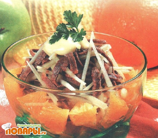 Апельсин и яблоко очищают от кожицы и семян. Мясо и яблоко нарезают соломкой, мякоть апельсина - ломтиками.