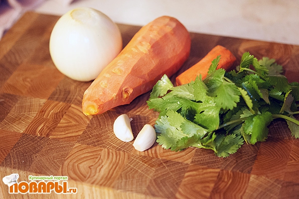 Лук и нарежем тонкими полукольцами, чеснок измельчим ножом или в ступке и порубим мелко кинзу.