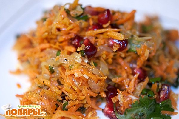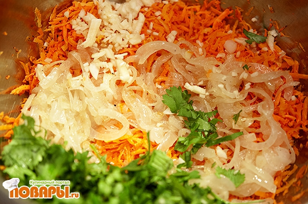 Соединим все ингредиенты - морковь, чеснок, жареный лук и кинзу и немного подсолнечного масла.
