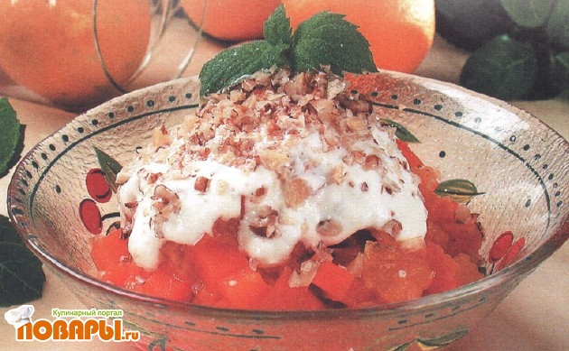 Подготовленные продукты соединяют и заправляют сметаной, смешанной с орехами.