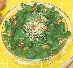 Нарезанные листья одуванчика смешать с рублеными орехами. Салат заправить растительным маслом, смешанным с мёдом.