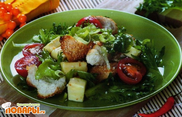 Приготовить заправку: смешать оливковое масло с горчицей и измельченным чесноком. Полить салат заправкой, украсить зеленью. Салат можно посолить по вкусу.