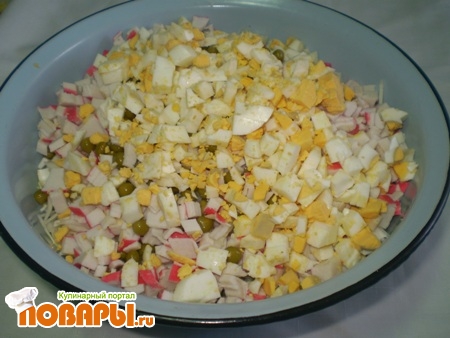 порезать мелкими кусочками крабовые палочки, лук также порезать мелкими кусочками, добавить горошек.