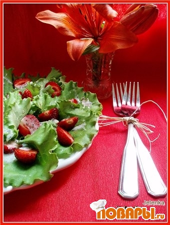 Вымыть листья салата и порвать руками, выложить на тарелку, сверху выложить клубнику и полить соусом маковым. На каждую тарелку по 1 ст.л. соуса.