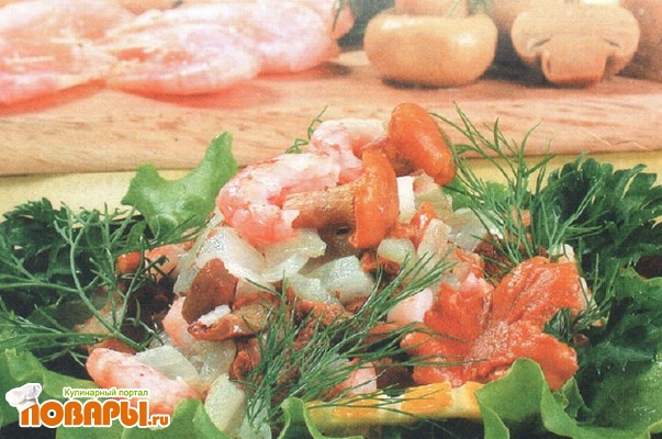 Креветки разделывают, варят в течение 5 минут в подсоленной воде, охлаждают и мелко нарезают.