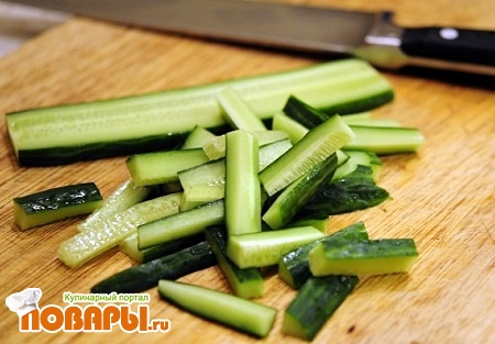Огурец нам понадобится среднего размера, лучше взять огурец «длинного» сорта или так называемого пекинского. Огурец помыть и порезать сперва на 3 части в длину, после еще на 2-3 части. Приблизительные размеры 7 см. в дину и 2 см. в ширину.
