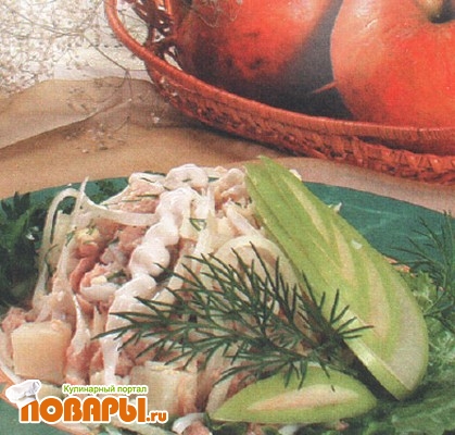 Яблоко без кожицы и сердцевины натирают на терке (немного оставляют для оформления), лук нарезают кольцами.
