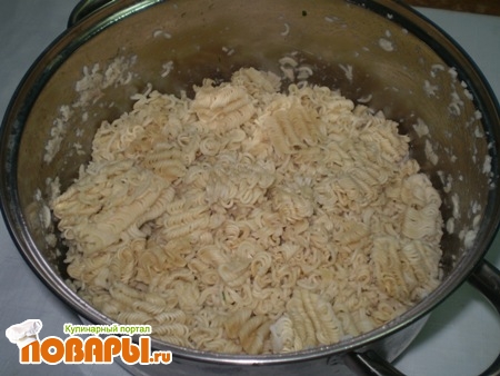 Для начала приготовления нужно измельчить макароны быстрого приготовления и залить кипятком, чтоб приготовились, только воды не много, чтоб только покрыла макароны, лучше ее меньше, чем больше, потом остудить.