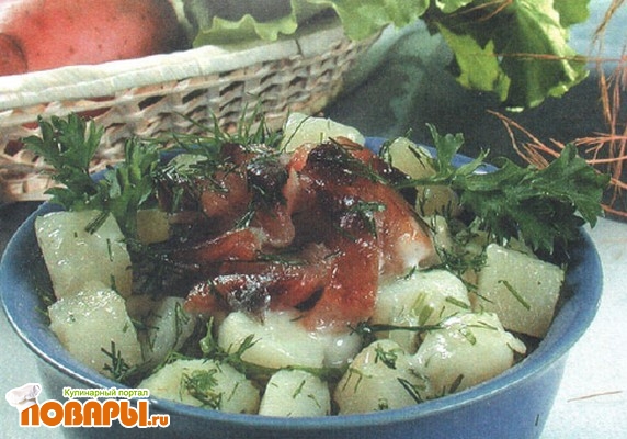 Картофель отваривают в мундире, очищают от кожицы и нарезают кубиками.