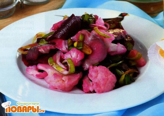 Смешать в салатнике капусту сельдь и свеклу, добавить зеленый лук и лук-порей. Заправить салат растительным маслом и соком лимона, приправить по вкусу молотым перцем.
