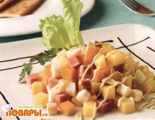 Ветчину, сыр, яйца и картофель нарежьте кубиками, чеснок измельчите.