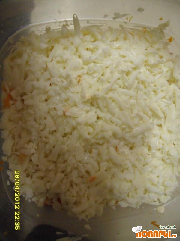 Отвариваем яйца и отделяем их от белков и желтков. Трём на терке белки, выкладываем их на майонез