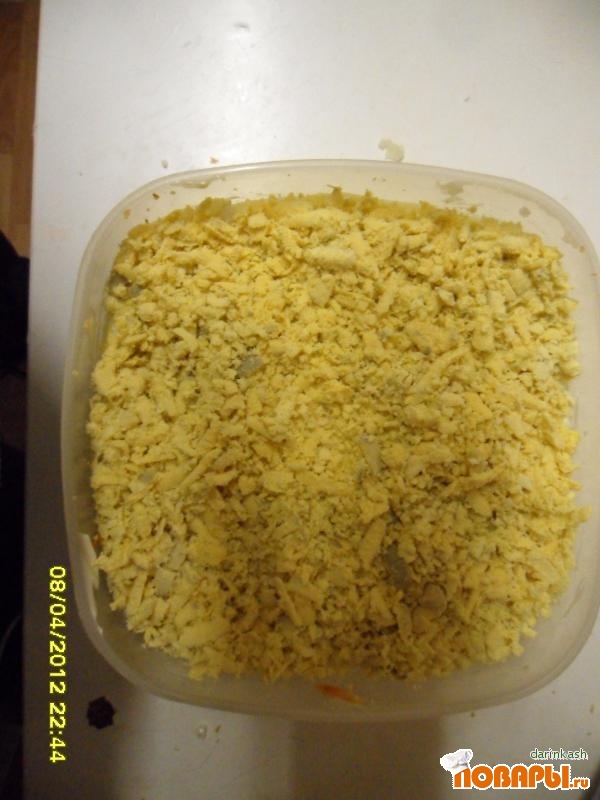 и закрываем майонезом. На майонез снова кладем картошку и закрывает майонезом. Трём на терке желток и аккуратно посыпаем им слой майонеза.