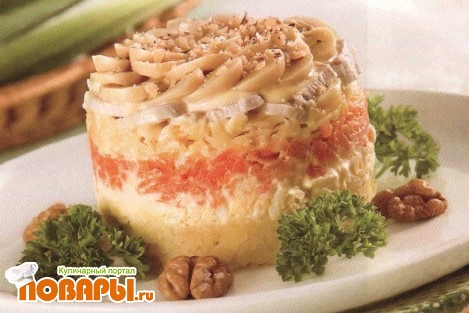 Выложите 1/2 подготовленных ингредиентов слоями, поливая майонезом, затем выложите нарезанные ломтиками курицу, грибы, посыпьте орехами.