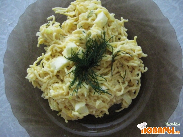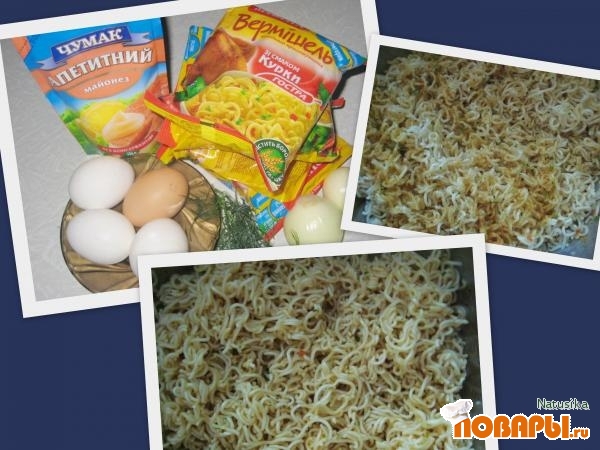 Для приготовления данного салата следует вскрыть пакетики с лапшой и приготовить её следуя рецепту написанному на самом пакете: достать лапшу, залить кипятком её на три минуты, слить излишки воды. засыпать в лапшу специи. Яйца отварить в крутую, очистить от скорлупы и нарезать кубиками.