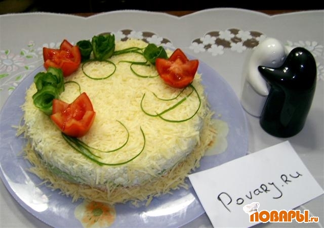 Вынуть форму из холодильника, перевернуть на блюдо, снять с салата пленку.