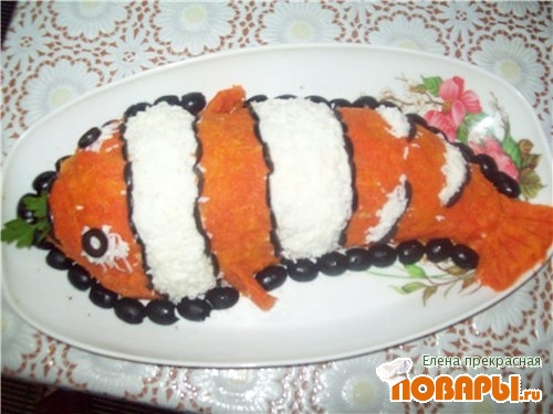 На блюде выложить в форме рыбы (идею украшения взяла на форуме-готовим дома), морковь натереть на мелкой терке,выложить тельце рыбки,сделать полоски из белка,выложить глаза и полоски из маслинок.