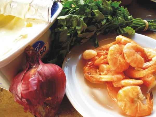 Лук хорошенько отцедить и соединить с креветками, перцем, петрушкой, посолить и поперчить по вкусу, заправить майонезом.