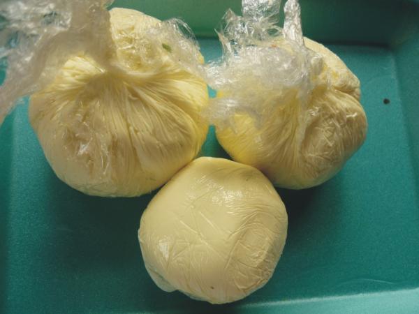На середину сыра выложить половину начинки, с помощью нижнего листа пленки сформировать шарик, так что бы сыр был снаружи, а начинка внутри.