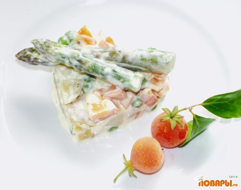 Спаржу очистить, нарезать пополам, отварить в подсоленной воде, у платано отрезать кончики, разрезать пополам и сварить в воде до готовности - минут 10. Охладить. Нарезать морковку и очищенную картошку на кубики. Платано очистить от кожуры, нарезать кубиками.