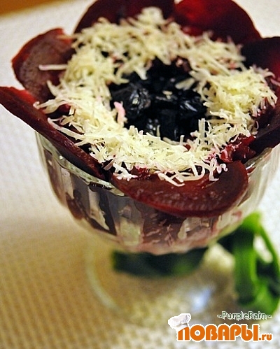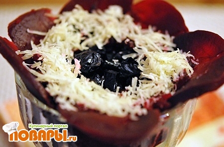 Нам нужно заранее подготовить некоторые ингредиенты для нашего цветочного салата -отварить свеклу и остудить ее, а так же замочить в теплой воде чернослив, после промыть и немного подсушить.