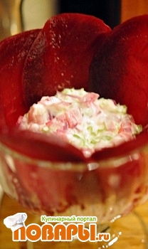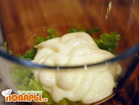 Теперь нужно все ингредиенты собрать в один цветочек. Для этого в отдельной чашечке смешаем лимон, лук и листья салата. Заправим майонезом или сметаной. Хорошо перемешаем.