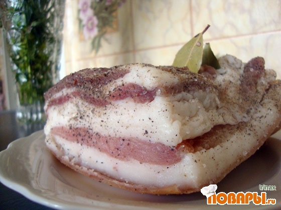 Смешайте соль,перец,базилик. разотрите лавровый лист ладонями. Кончиком ножа сделайте небольшие, но глубокие разрезы и нашпигуйте чесноком. Натрите сало смесью соли и специй.