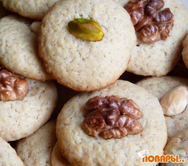 Сверху украсить печенки орехами, немного вдавливая их в тесто.