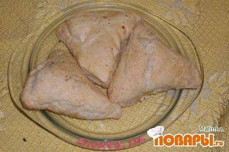 Тесто раскатать,вырезать кружочки,начинку кладём на середину круга и заворачиваем,сначала одну сторону,потом другую и и снизу накрываем третьей стороной,на противень кладём швами вниз.