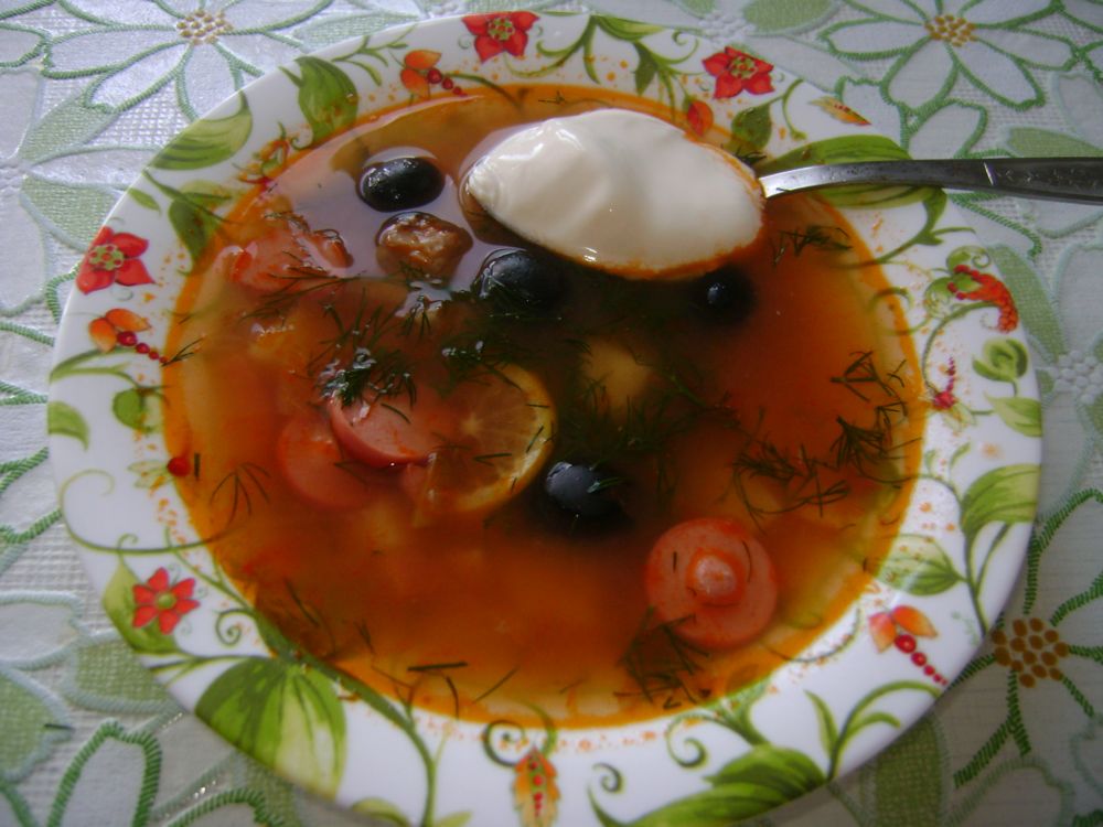 Когда картошка готова,добавляем по очереди в кастрюлю: мясо (из бульона), мясные деликатесы, огурчики, лимон, маслины. Варим еще минут 5. Кушаем со сметаной.