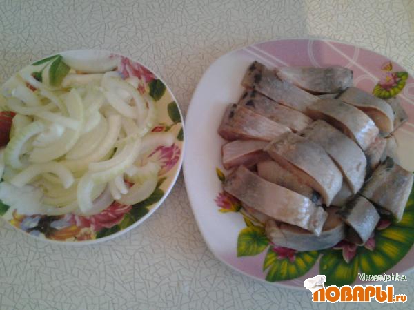 Сельдь почистить и порезать на кусочки, лук порезать полукольцами.