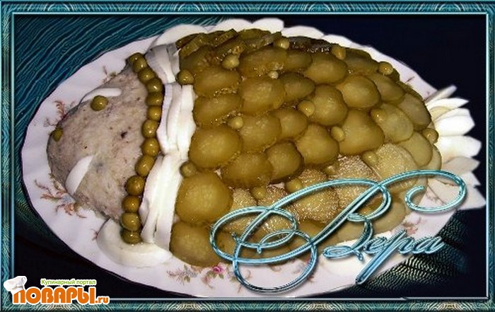 Огурец нарезать кружками, уложить в виде чешуи. Из белка оформить