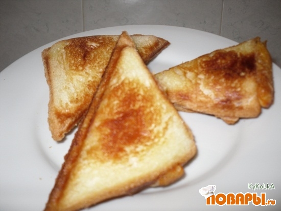 Сверху накройтй еще одним ломтиком хлеба, смазанной маслом стороной на верх и закройте сэндвичницу для запекания сэндвича на 3 минуты.