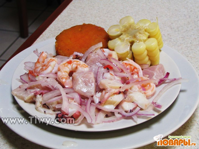 Сложить рыбу с луком в стеклянную емкость, внутреннюю поверхность которой предварительно натереть кусочком острого перца, добавить лед и соль. Выдавить лимонов столько, чтобы сок составлял ¾ объема рыбы с луком. Перемешивать все в течение 30 сек.