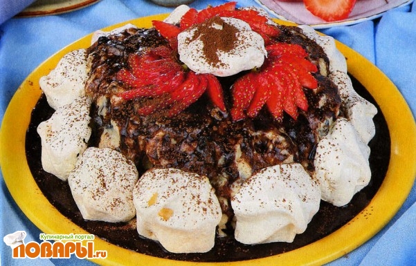 Печем безе (или можно купить готовые меренги): 3-4 охлажденных белка и 1,25 стакана сахара взбиваем миксером, постепенно добавляя порциями сахар. Когда в этой массе стоит ложка - белки готовы. На промасленной кальке выпекаем безе: ставим в хорошо разогретую духовку, а после того, как безе поднимется, убавляем жар до 100~120 градусов и сушим. Когда безе остынет снимаем с кальки.